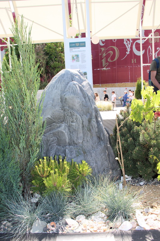 Очень необычна была композиция Воронежской области. Пожалуй, здесь интересны даже не столько растения, хотя и они, конечно, есть, сколько то, на чём они растут, – почвы. В огромном стеклянном сосуде можно посмотреть профили самых распространённых почв плодородной Воронежской области, в том числе лучшей в мире – типичного чернозёма.