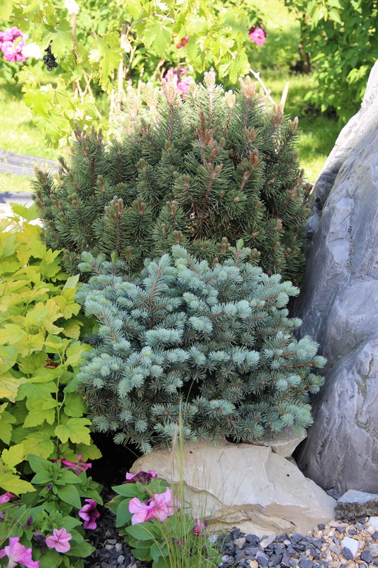 Ель колючая ‘Глаука Глобоза’ (Picea pungens ‘Glauca Globosa’), а также карликовые сорта сосны горной (Pinus mugo) ‘Голден Глоу’ (‘Golden Glow’) и ‘Коломбо’ (‘Columbo’) символизируют леса гор и предгорий. Серебристо-голубая шаровидная ель прекрасно сочетается с соснами – тёмно-зелёной конусовидной ‘Коломбо’ и подушковидной ярко-зелёной ‘Голден Глоу’. Последний сорт к тому же зимой меняет цвет хвои на жёлтый. Всё это подчёркивает красоту и разнообразие горных лесов. В целом сосна, благодаря своей несменяемой красоте и неприхотливости, служит символом надёжности и постоянства.