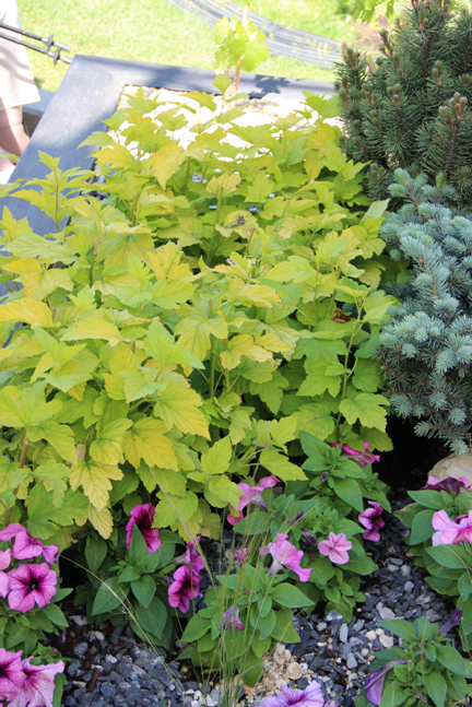 Желтолистный пузыреплодник калинолистный ‘Наггет’ (Physocarpus opulifolius ‘Nugget’) и газонные травы символизируют плодородную Прикубанскую низменность, бескрайние поля подсолнечника и пшеницы.